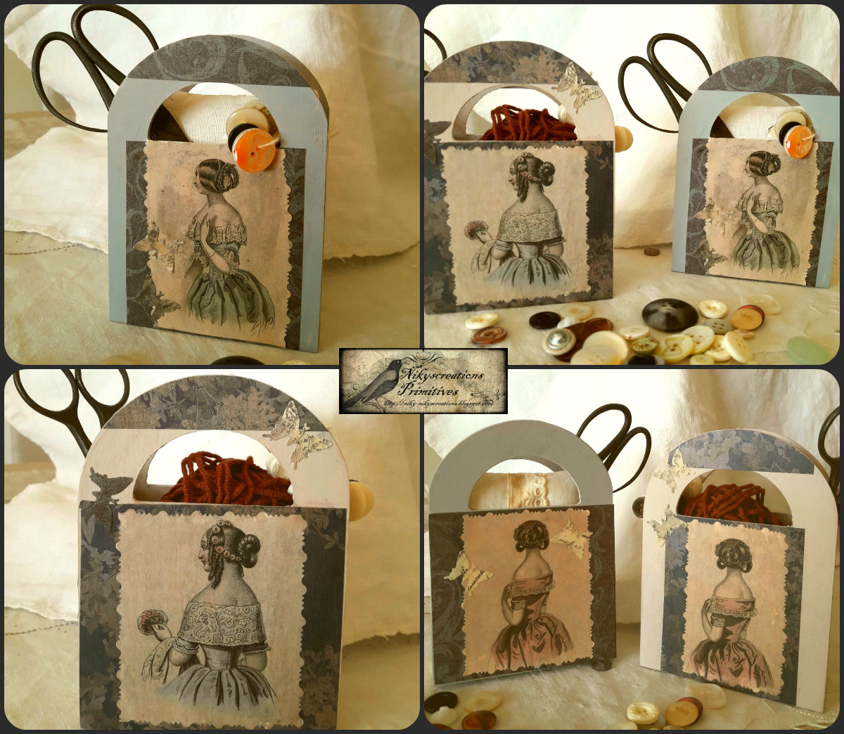 Those lovely Wood bags are so sweet. I put beautiful Victorian pictures on them and they are so useful to keep your stitching tools.